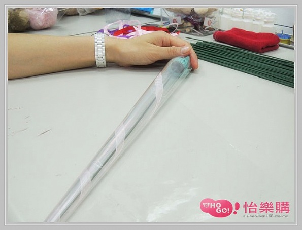 之後將精皂花束底端與透明PVC固定後就可以開始捲啊捲啊~~